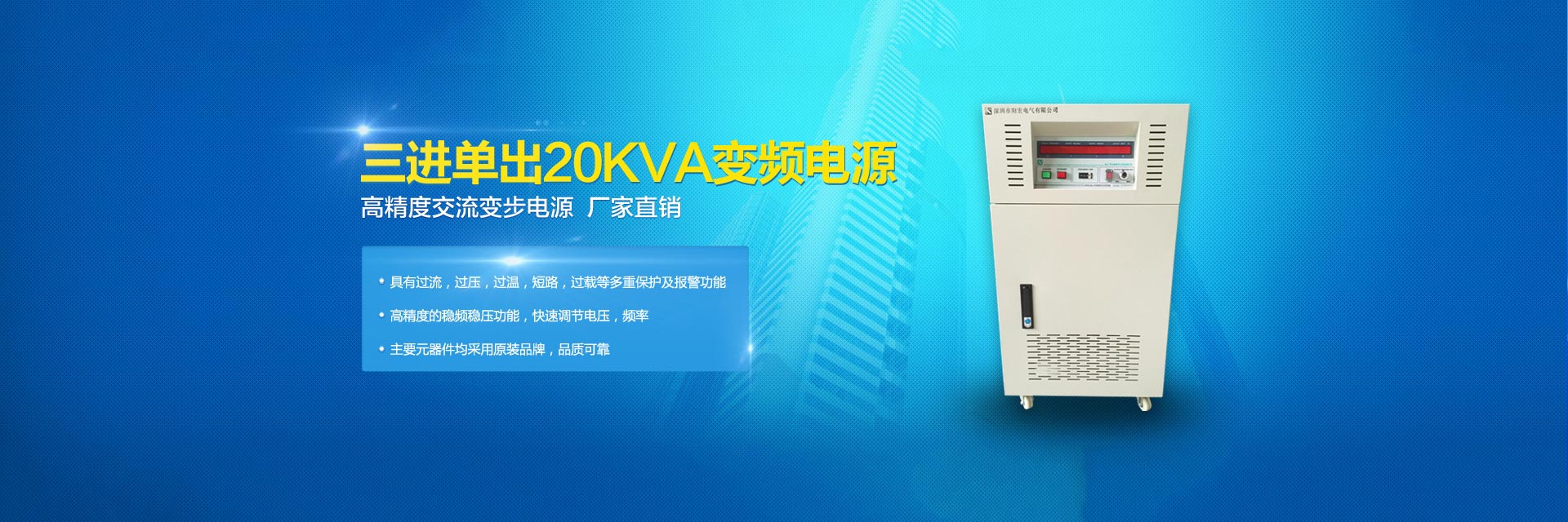 20年變頻電源制造品質(zhì)-陽宏變頻電源為您提供5KVA變頻電源,10KVA變頻電源,20KVA變頻電源,30KVA變頻電源,45KVA變頻電源,60KVA變頻電源,75KVA變頻電源,深圳單相/三相/交流變頻電源等。 模擬式變頻電源,晶體管式變頻電源,可編程式變頻電源,單相大功率變頻電源,三相大功率變頻電源是陽宏電源股份有限公司的核心產(chǎn)品。深圳市陽宏電氣有限公司隸屬臺灣陽宏電源股份有限公司,是一家變頻電源開發(fā)、研制、生產(chǎn)、銷售和服務(wù)的高新技術(shù)企業(yè)。其大陸工廠:深圳市陽宏電氣有限公司,是臺灣陽宏電源股份有限公司在中國大陸一家分公司,地址:深圳市寶安區(qū)觀瀾街道觀瀾高新科技園區(qū)。 臺灣陽宏電源股份有限公司創(chuàng)建于1995年,目前除了臺北公司以外,在中國的廣東深圳設(shè)有分公司,工廠擁有許多的先進(jìn)設(shè)備。具有年產(chǎn)各種電子儀器電源設(shè)備20000臺以上,工廠有嚴(yán)格的生產(chǎn)能力,強(qiáng)大的開發(fā)技術(shù)的管理制度,可以接受新高技術(shù)產(chǎn)品的開發(fā)與研制。